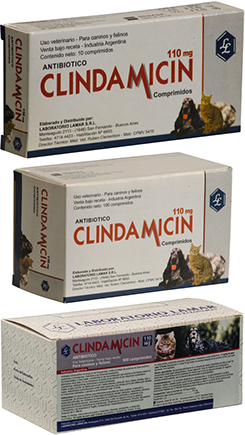 En caninos y felinos, para infecciones producidas por Gram positivos, anaerobios y micoplasmas. De primera elección en enfermedad periodontal, heridas infectadas, osteomielitis, abscesos, piodermitis profundas, etc. Antibiótico de alternativa en piodermias superficiales o resistentes a los antibióticos de primera elección, infeccio-nes pulmonares, y otitis. Su espectro incluye los géneros Staphylococcus (incluso productores de ß-lactamasa), Streptococcus, Actinomyces, Nocardia, Mycoplasma y Toxoplasma; y los anaerobios B. Fragillis, Fusobacterium, Peptoestreptococcus y Clostridium (con excepción de C. difficile).