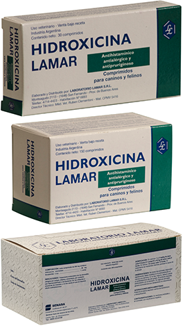La hidroxicina es un antihistamínico piperacínico moderno, indicado especialmente para dermatitis alérgicas (a las pulgas, por contacto, atopía, prurito, etc.) pero también eficaz en todos los otros fenómenos en que se requiere acción antihistamínica. Inhibe tanto los fenómenos de hipersensibilidad inmediata, como los producidos a las 24 horas de la acción del alergeno. Una cuarta parte de todos los casos de dermatitis alérgica que se presentan en el consultorio, se pueden tratar eficazmente con hidroxicina sola, sin glucocorticoides. En caso contrario, la utilización de la combinación hidroxicina/glucocorticoides permitirá disminuir la dosis de éstos, con consecuentes menores efectos secundarios.