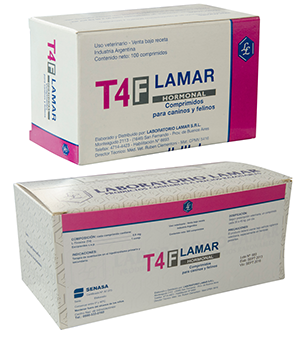 Observaciones: Se requiere el diagnóstico exacto de hipotirodismo. Se aconseja la investigación de tiroxina sérica por radio inmunoensayo en un laboratorio especializado en medicina veterinaria. En animales en que coexista insuficiencia corticoadrenal con el hipotiroidismo, deben reemplazarse primero las hormonas adrenales. En pacientes con diabetes mellitus, insuficiencia cardíaca o arritmias, comenzar con dosis bajas y aumentarlas paulatinamente. La intoxicación por sobredosis, o por error de diagnóstico, es posible con T3 y muy difícil con T4, por la diferente actividad y metabolismo de cada hormona. Se manifiesta por poliuria y polidipsia, nerviosismo, taquipnea y temblores musculares. Se soluciona disminuyendo la dosis gradualmente.